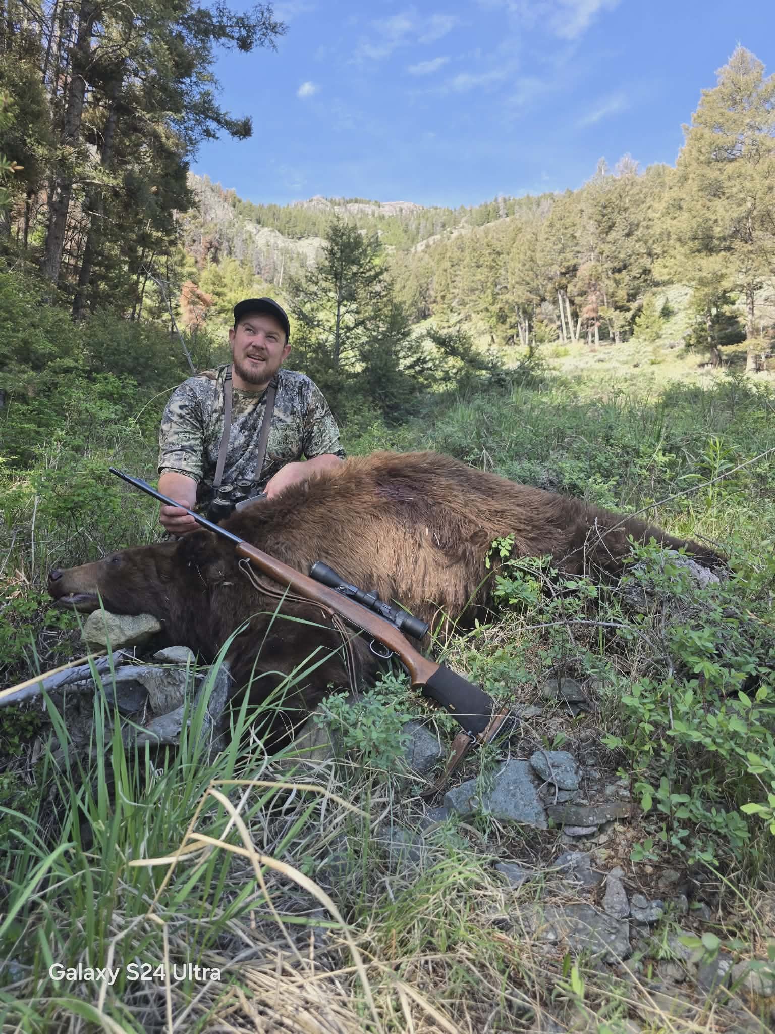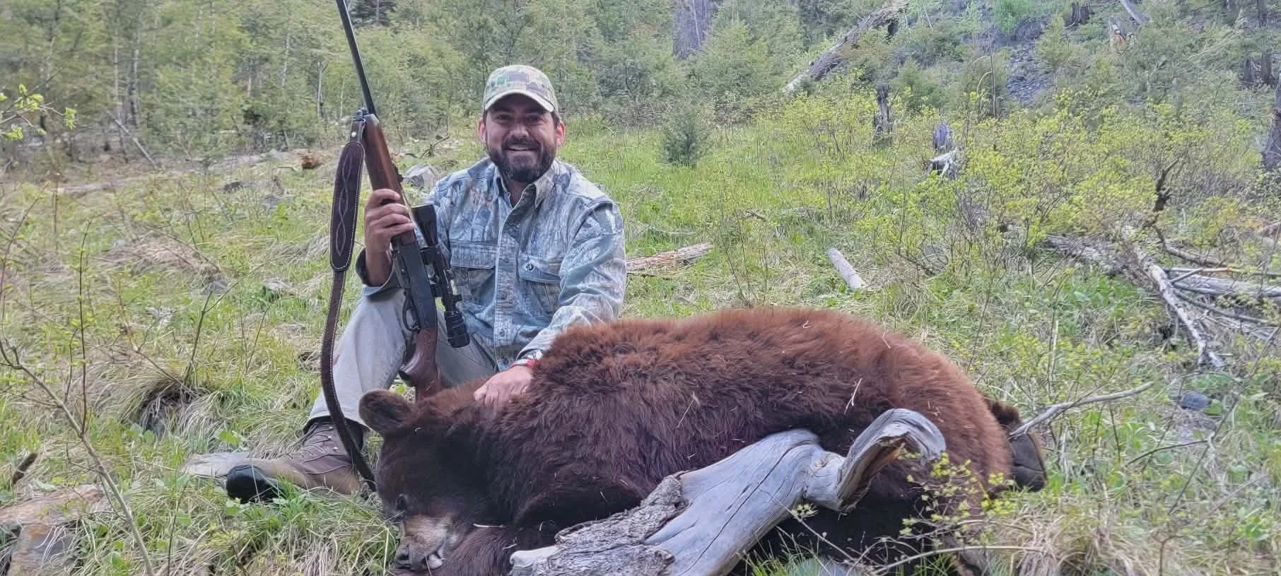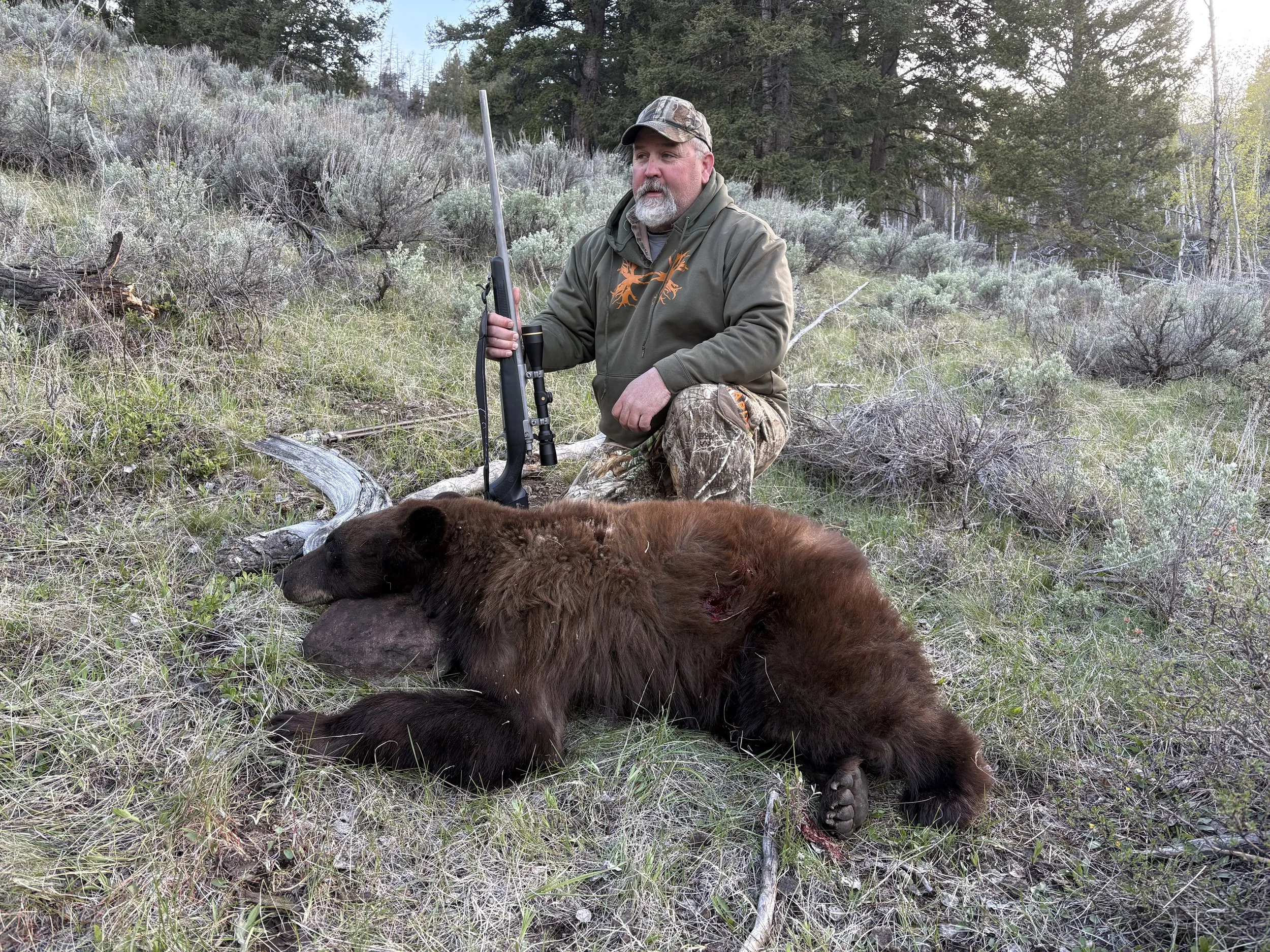 Our spring bear hunts offer an incredible opportunity to pursue mature black bears in some of the most scenic country in Idaho. We hunt primarily over bait and maintain a large number of active bait sites to provide consistent opportunities throughout the season. Most of our baits are accessed on horseback, giving you a true backcountry experience as you ride through remote country to your stand. The bears we hunt come in a wide range of beautiful color phases—black, chocolate, cinnamon, and blonde—making every encounter exciting and unique. Spring is the perfect time to explore the Boulder-White Cloud Mountains, as the country comes alive with green hillsides, snow-capped peaks, and active bears emerging from their winter dens. Bear hunts are conducted out of a lodge, hunters stay in comfortable cabins with showers and bathroom. Each morning and evening home cooked meals are served.